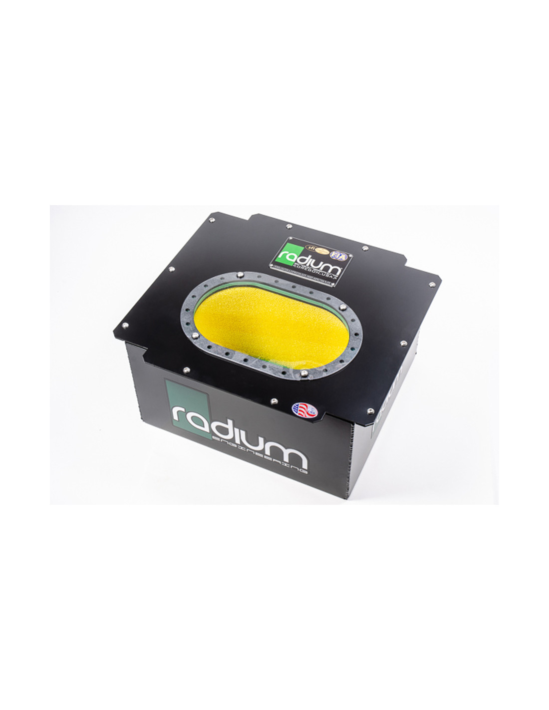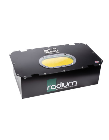 10 Gallon fuel cell manufactured by Radium Engineering. Carries FIA and SFI certification. Compatible with gasoline and alcohol fuels. Includes bladder, outer can, internal foam and aluminum nut-ring with gaskets.