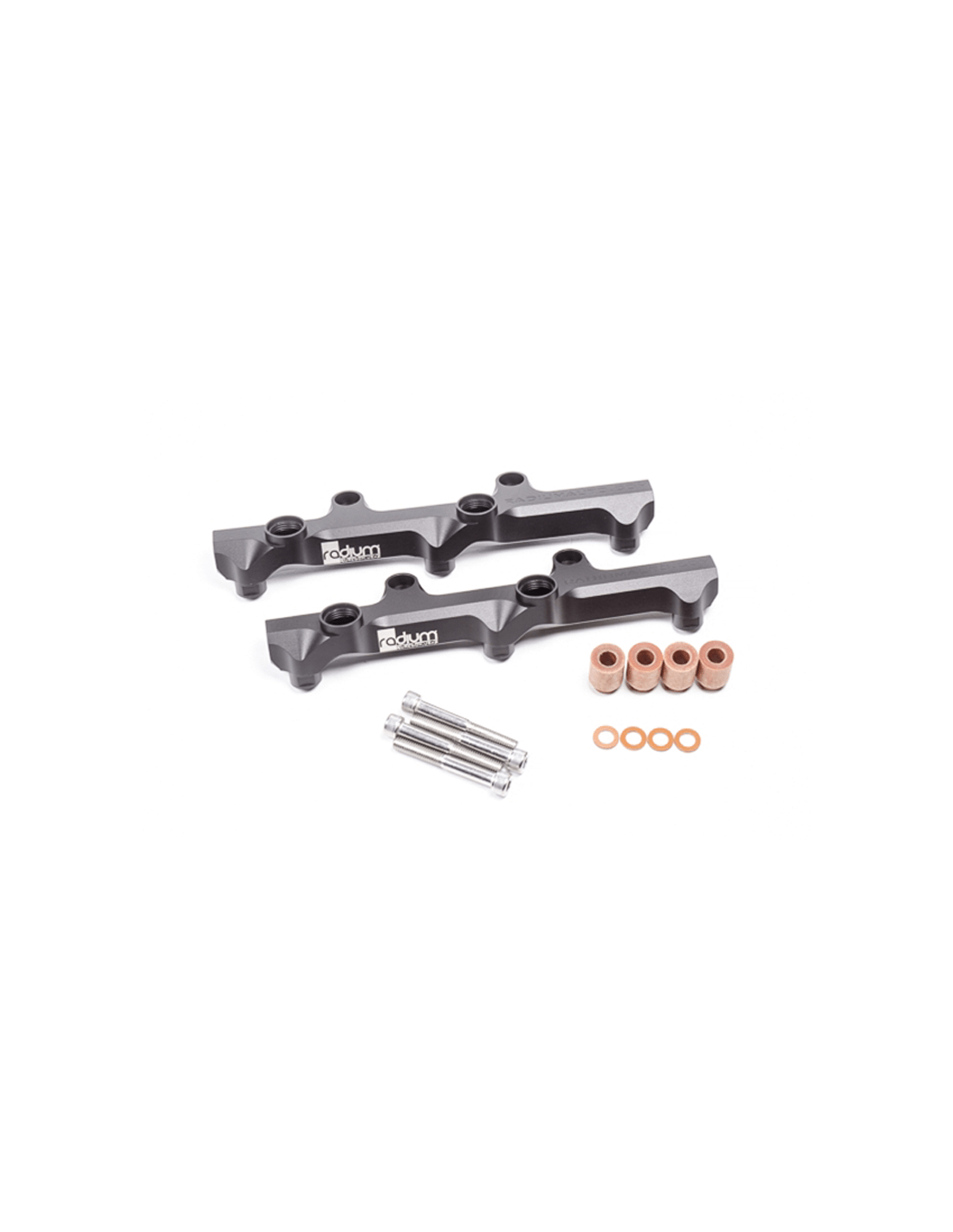 Ett fäste i rostfritt stål finns till Radium FPR. SAE-adaptrar med låg profil och PTFE-bränsleslangar ansluter OEM-bränsleledningarna till FPR. PTFE-bränsleledningar går från FPR till de bakre Fuel Railsportarna. Två Radium-bränslepulsdämpare och en tryckmätare ingår och alla nödvändiga adapterkopplingar