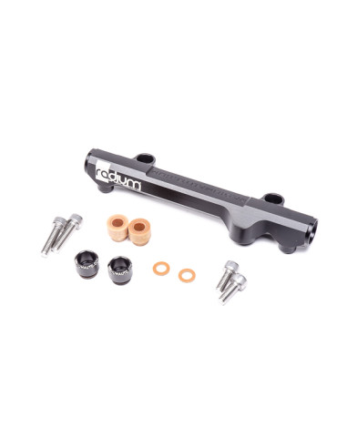 The Radium Engineering high flow secondary fuel rail is for the 13B-RE rotary engine originally found in the 1990-1995 Mazda/Eunos Cosmo. The aluminum fuel rail is anodized black for compatibility with all popular fuel types including E85. Manufactured with a large internal bore, the fuel rail can support all necessary engine power requirements. Like the stock fuel rail, the rail features 11mm injector bores permitting the use of OEM fuel injectors.